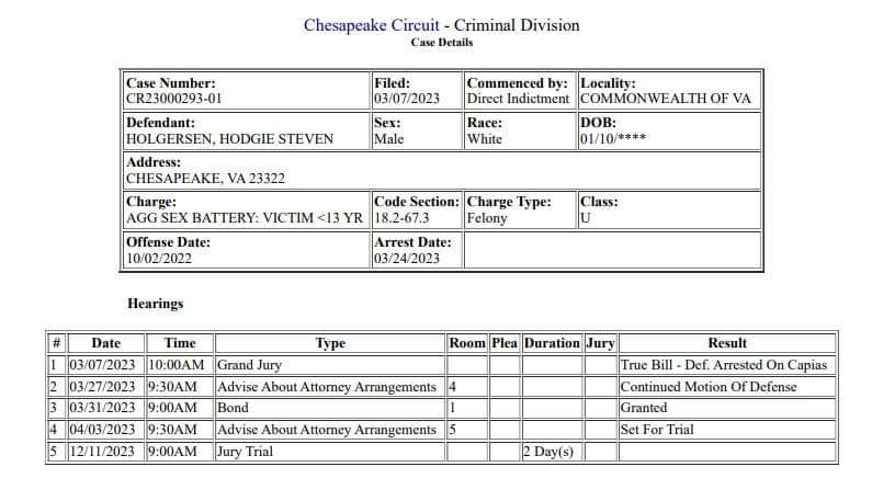 Hodgie has been allowed to attend meetings up until his recent arrest on March 24, 2023 – recorded as “aggravated sexual battery” toward a child under the age of 13, and “indecent liberties” with a child under the age of 15. These offenses occurred in October of 2022.