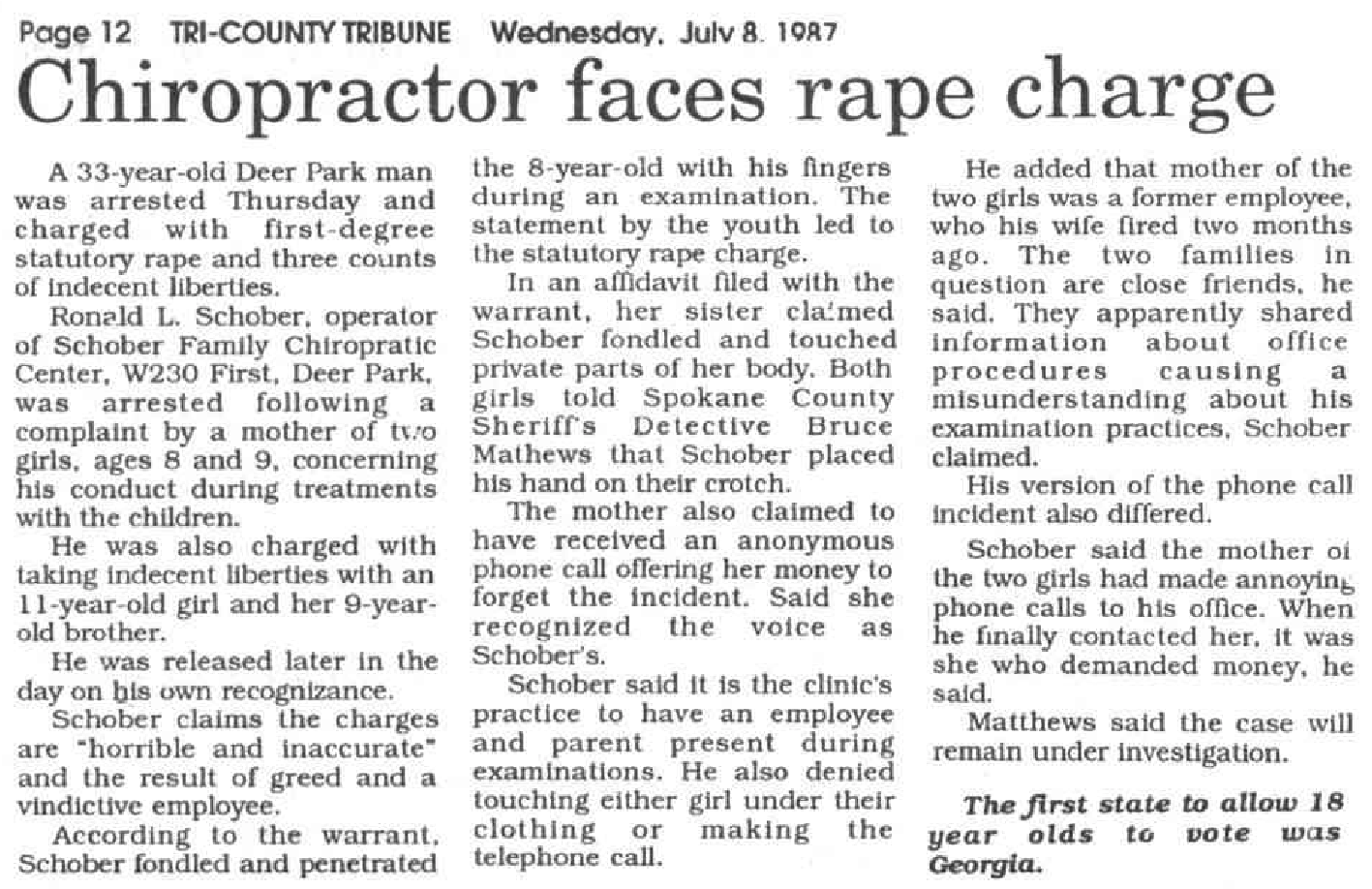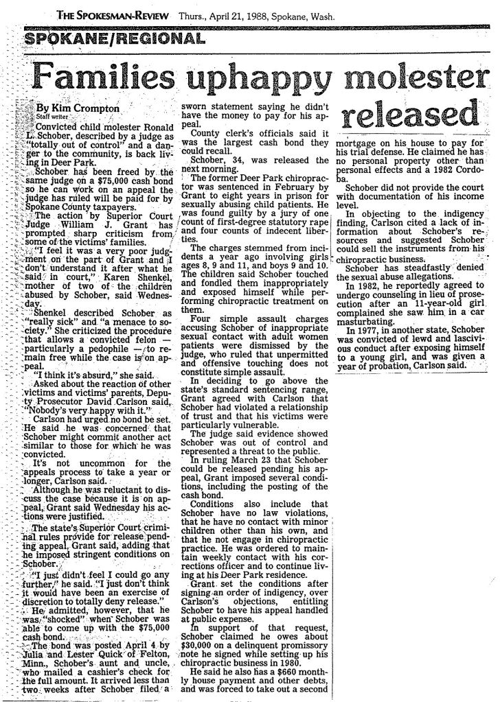 WA State records Case 937474 show that Ronald Schober was convicted in a ‘Rape of Child’ case, probably in 1988, and he is known to have served prison time.