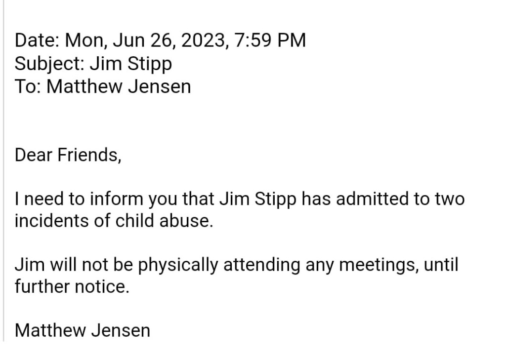 2. “Jim Stipp ADMITTED to two incidents of child abuse. (Jim)…will not be in meetings until further notice”. Until further notice? I guess zero tolerance is not so zero tolerance here. What do you really expect? Welcome back, Jim!