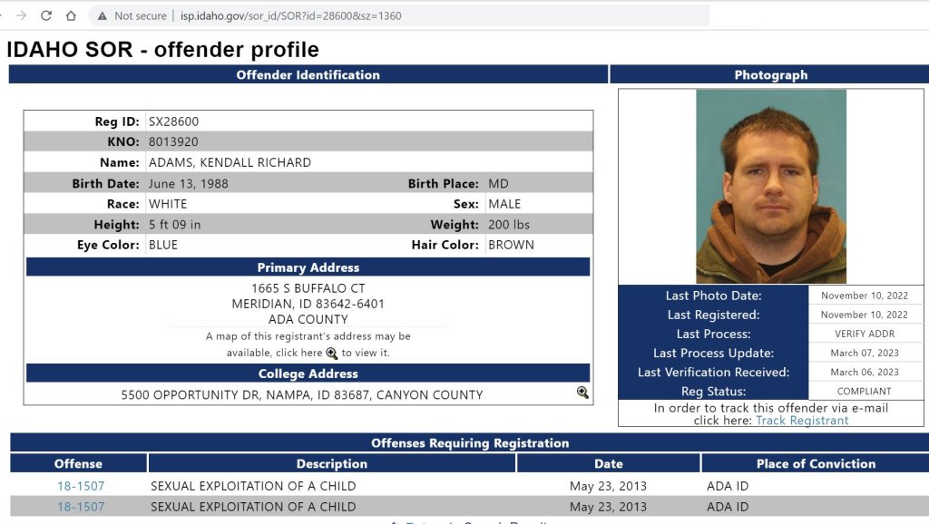 Kendall Adams is understood to be still attending meetings in Idaho. Details of his 2013 convictions and entry on the Idaho Sex Offender Register are being shared so those in the area attending meetings with children who may have contact with Kendall are aware of the history.
